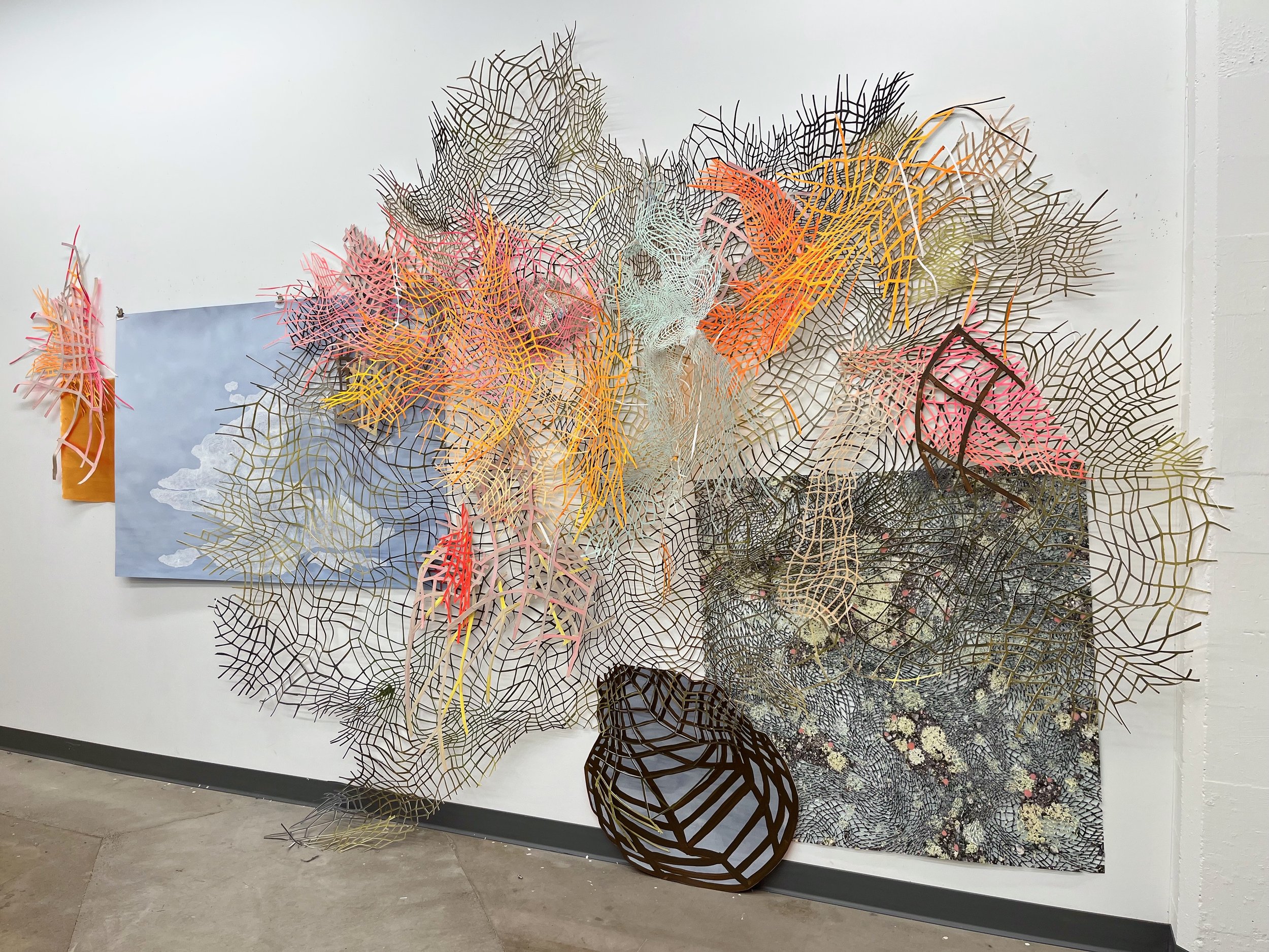 Drawing – sometimes visible, sometimes not – is the animating force of my work. Paper either serves as the ground for drawing or it becomes the line itself through hand cutting. I treat the paper before I begin working, either by printing photographic images or applying color fields (watercolor or acrylic). Ink drawings either appear on top of printed images or happen on the back of the paper to guide the cutting. The net - this flexible, shape-shifting grid loaded with complicated associations - has given me a structure and process for enacting and imagining change, porosity and entanglement. I work with the net in a range of scales and contexts simultaneously. I am endlessly interested in the way an unpredetermined field or form emerges gradually and surprisingly from many simple decisions and actions. Spatially, the net always feels like magic – stretchy, malleable, unpredictable.